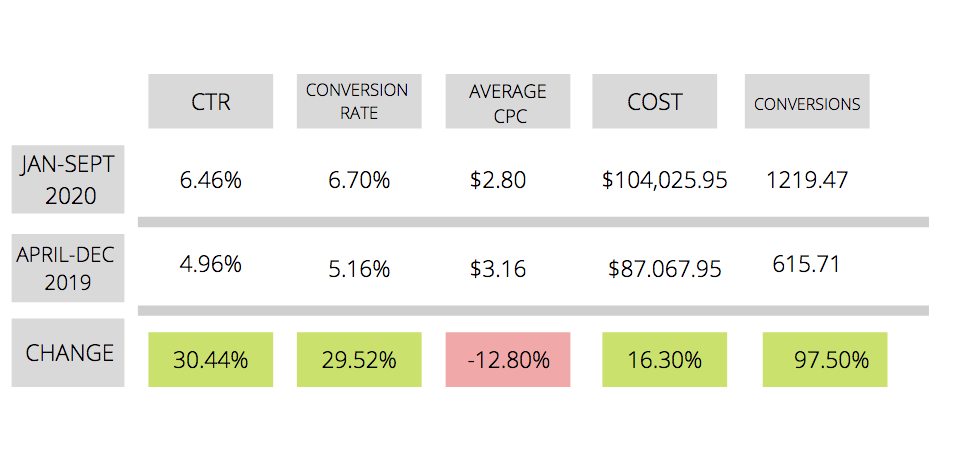 We were able to increase our click-through rate (CTR) and conversion rates by 30%. We nearly doubled our overall conversions, and we saw a near 13% drop in our average cost per click!
