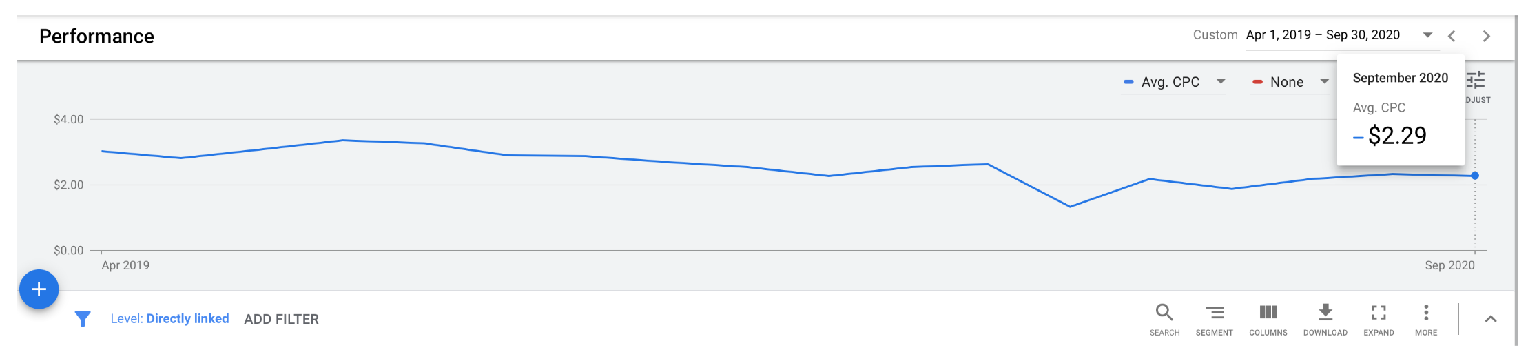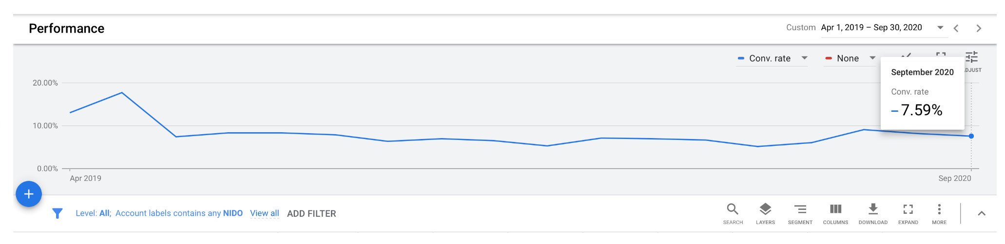 The ultimate goal here is to see a steady overall rise. This is why time and patience is so important. Over a period of 18 months, we saw nearly a 30% overall increase in conversion rates amongst all of our Google Ads clients.