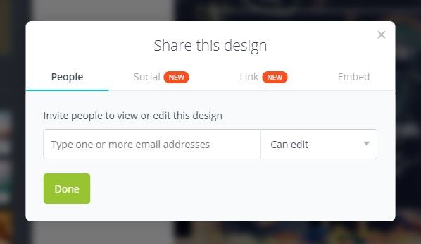 Once you’re finished creating you can download your file in PNG or PDF format. Or, you can choose to publish your design instantly on Facebook or Twitter, share the link with others, or easily embed your design on the web.