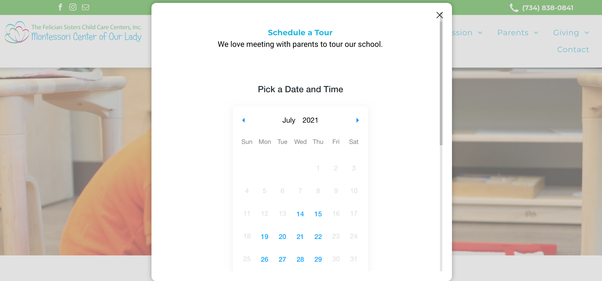 Montessori Thrive's solution is to set up easy-to-use calendars that work based on your availability so tours can be set up seamlessly to accommodate both the school's and the prospective parents' schedules.