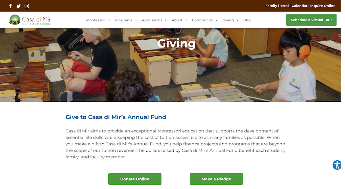If you rely on donations to keep your school running, dedicate a section of your website to make it easy for people to understand how and what they can donate. Include a top navigation section called Give or Support that encompasses all of the ways someone can contribute to your school.