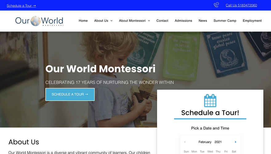 Prior to working with Montessori Thrive, Our World Montessori was having difficulty developing an easy-to-navigate and user-friendly website. It was clear to them that the time had come to re-do their school website into something modern, easy to use, and, most importantly, attract the right families to their school. As is the case with many Montessori schools, OWM did not have the time nor the resources to develop a whole new website with automation and compelling Montessori content. Instead, they dedicated their time running an incredible school, caring for the families they serve and making sure that OWM students received the highest quality Montessori education possible.