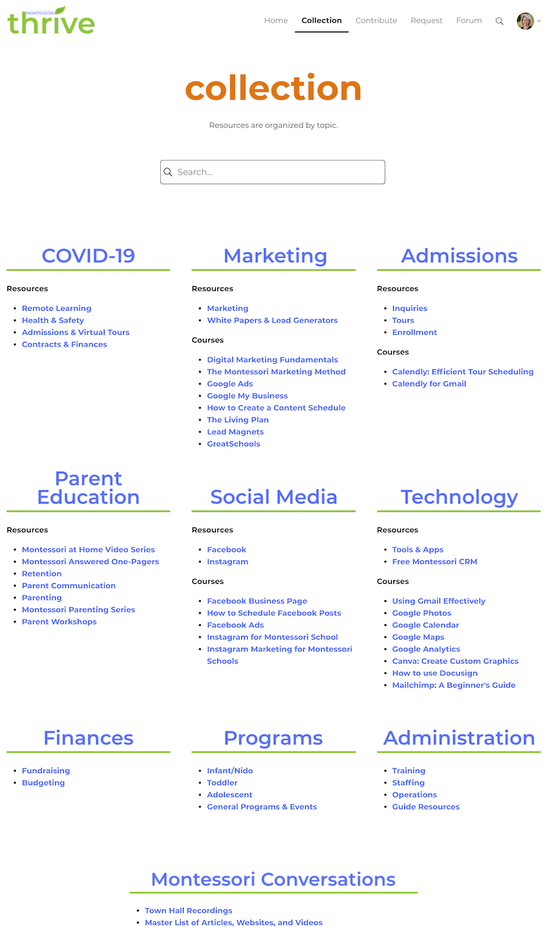 Montessori administrators can find a variety of resources from COVID-19 documents, Town Hall recordings, parent education tools, marketing courses and documents, and even social media tools all specifically tailored to the needs of a Montessori school.