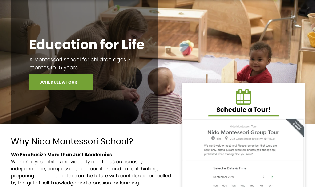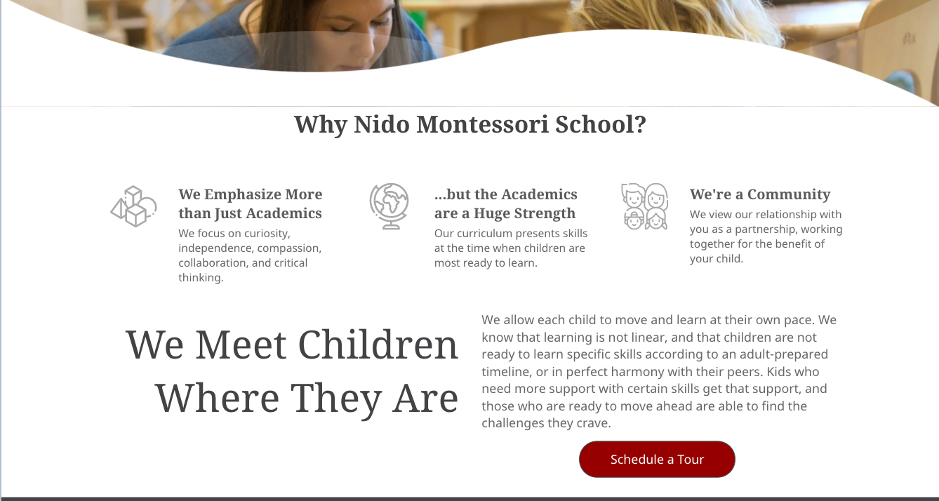 We could go on and on about the benefits of Montessori education, but doing this on your homepage risks overloading a parent with too much information before they’re ready. Instead, pique their interest by choosing 3 or 4 main distinctions about Montessori and include those on your homepage. It’s important to share with prospective parents the advantages of Montessori over other schools, as they’ll likely be comparing their options side-by-side. If they’re interested, they’ll dive further into your site to find out more.