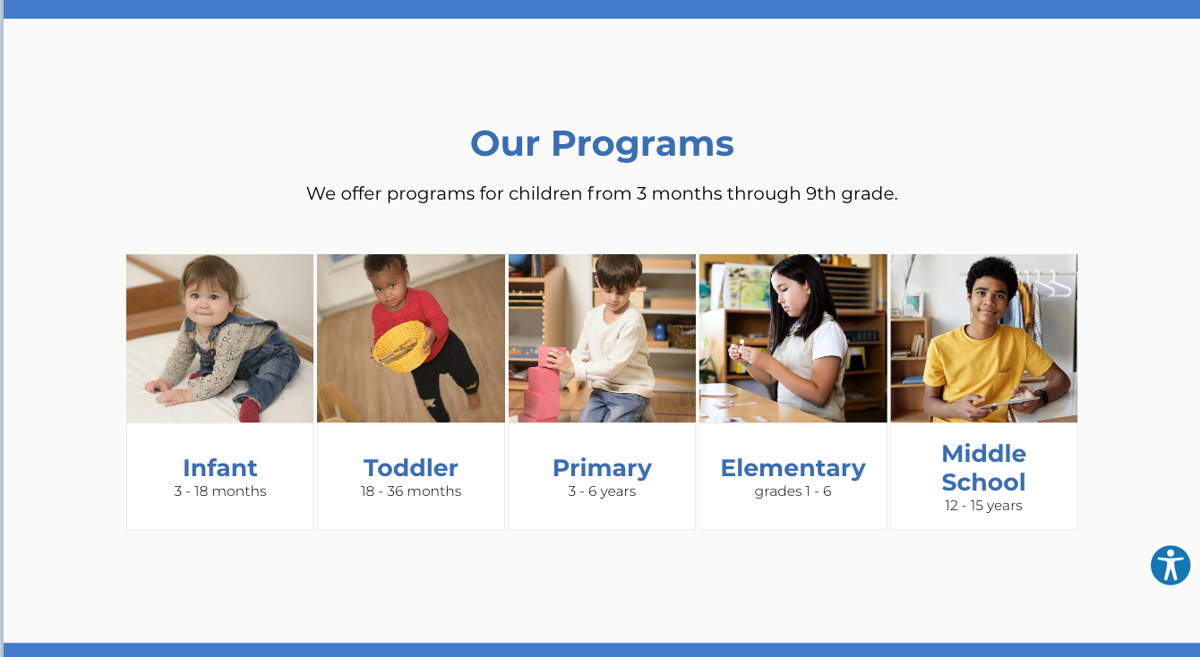 On your homepage, you should lay out your programs in a clear and concise manner. Be sure to include age ranges. Each program should link to a program page with more detailed information. On your homepage, however, it’s important to concisely show your range of programs in one glance.
