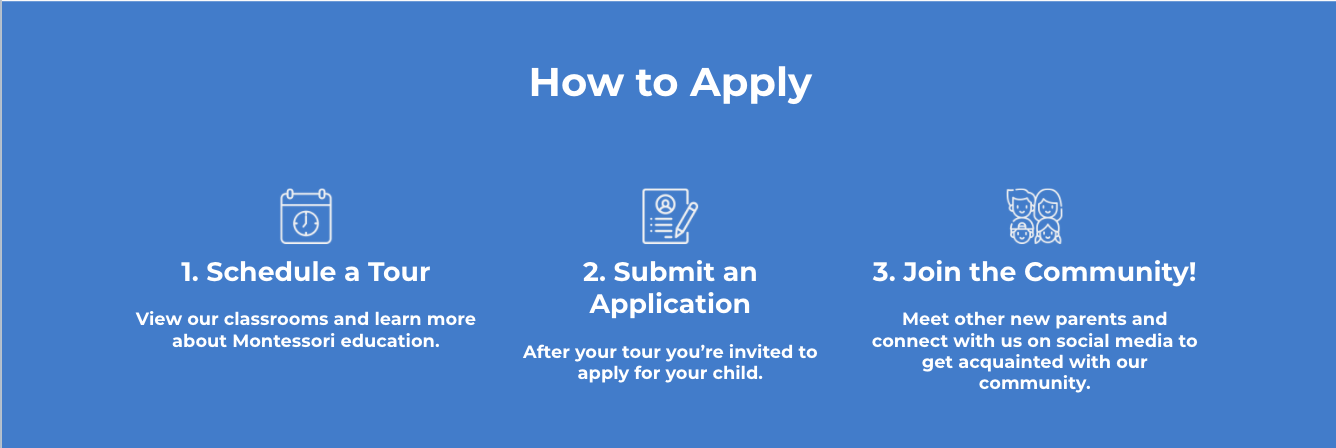 It’s likely that there are several steps in your admissions process, but don’t overwhelm a prospective parent with all of the details upfront. Distill your process into 3 steps that can be easily understood, so that the admissions process feels manageable and it’s very clear what that first step is.