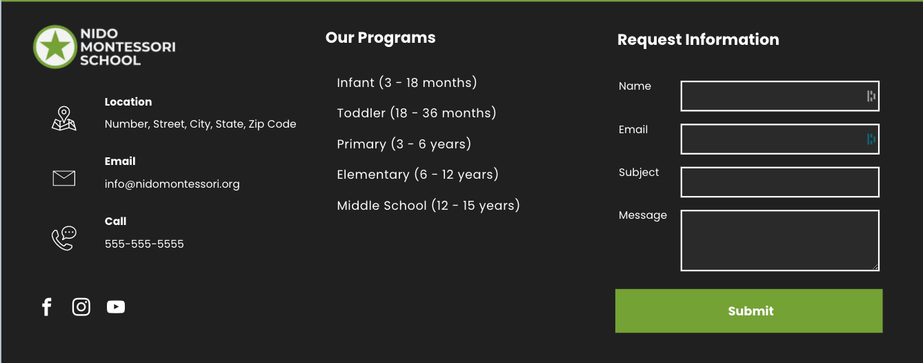 Some visitors might not be ready to schedule a tour right away. Provide other ways for visitors to engage with you. Offer your tuition rates or a white paper as a download in exchange for completing a short form. Be sure your phone number, email, and physical address are easy to find in the footer of your site.