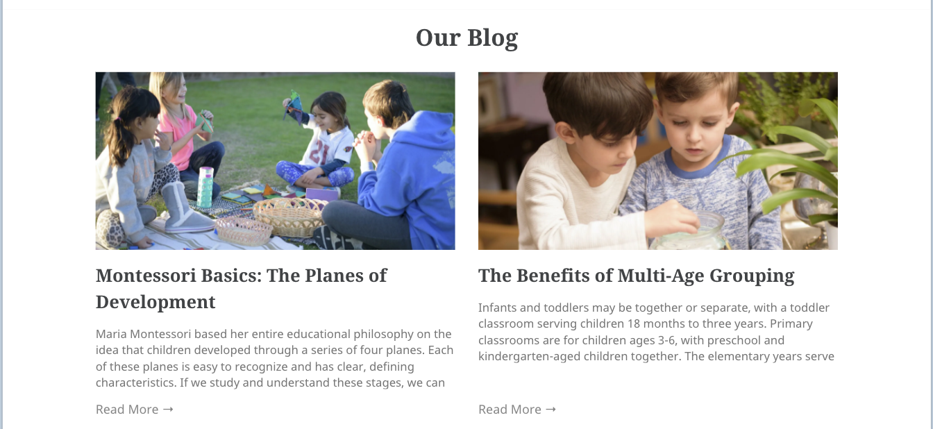 An active blog is one of the most critical pieces of your online marketing strategy—I’ll get into that more in my next article! On your homepage, your blog can help you stand out as a thought leader in the Montessori community. A current blog reflects a vibrant school. But it only works if you keep your blog content fresh! Strive for a new article every week. If this seems daunting, consider our Content Plan which includes a weekly blog article written by a Montessorian, in addition to emails, social posts, stock photos, and more!