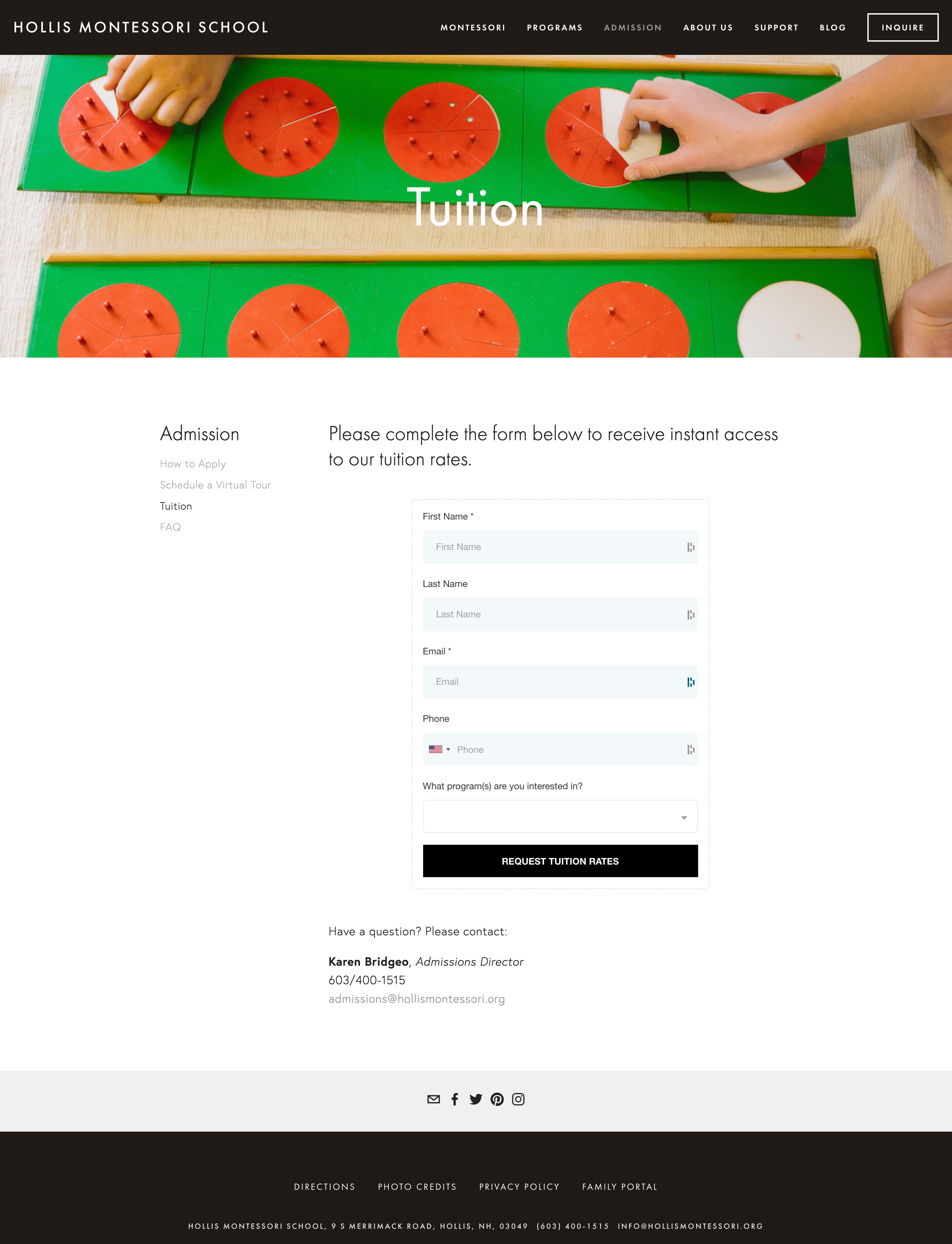 Hollis has valuable information such as tuition rates, blogs, and other helpful Montessori content, that they want to share with families from their website. In marketing, this is known as a lead generator - compelling information that requires the visitor to enter their contact information to access. By offering valuable content via a form request, Hollis delivers it directly to their inbox. In return, Hollis gains prospective parent's contact information so they can reach out to them with valuable information about their school.