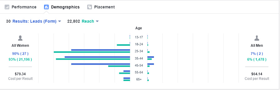 As the data shows here, you can see that women, between the ages of 25 and 54 are our highest performing audience. Anecdotally, we believe that it stays at home moms engaging with our ads on Facebook.