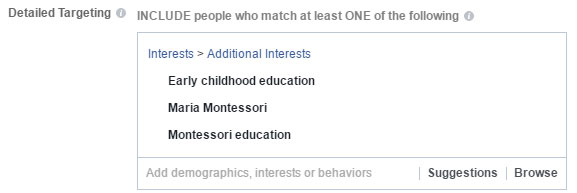 There are a plethora of targeting options available when it comes to advertisers on Facebook. I will spare you the hundreds of options when choosing an audience by placing an AMAZING infographic here. But let’s discuss what you came here for… Montessori enrollment growth!