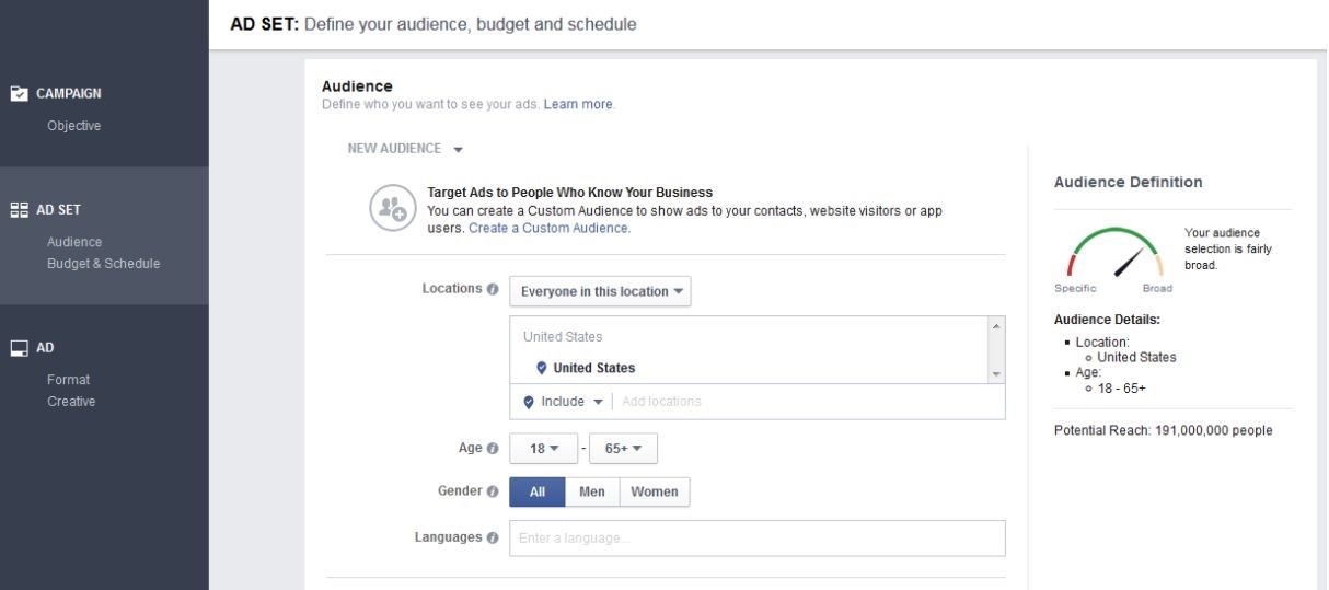 From your Facebook Business Manager account, go to Ad Set from the Ads Manager dashboard. Here is where you will start to develop your targeting strategy for your Montessori school by first defining your audience.
