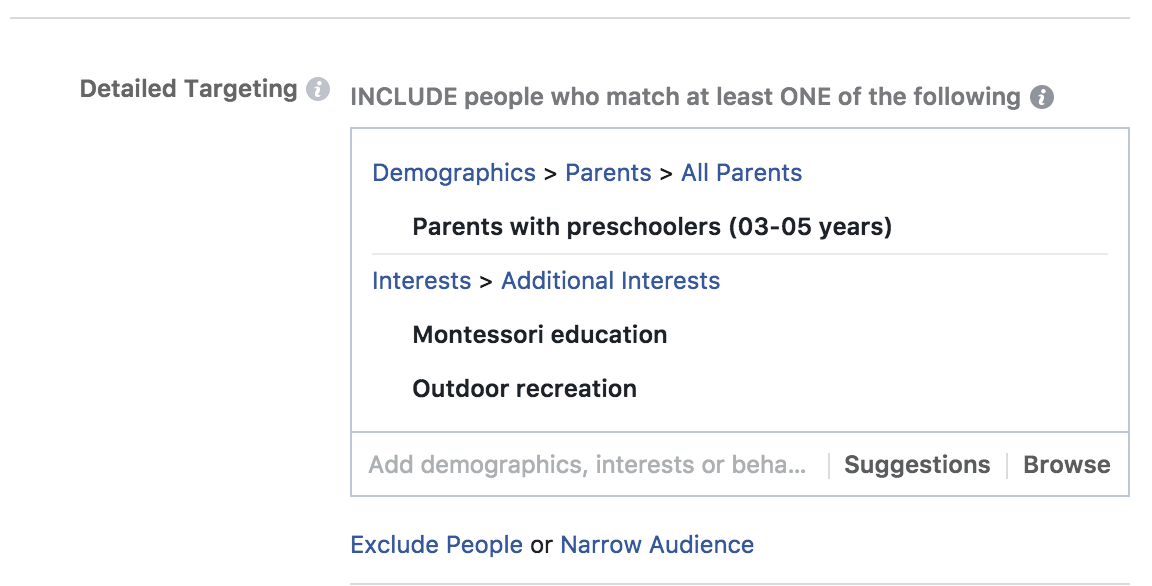 The Detailed Targeting feature lets you narrow your audience even further to make sure Facebook is showing your Montessori ads to the right people—but the trick is making sure you pay close attention to the language you use.