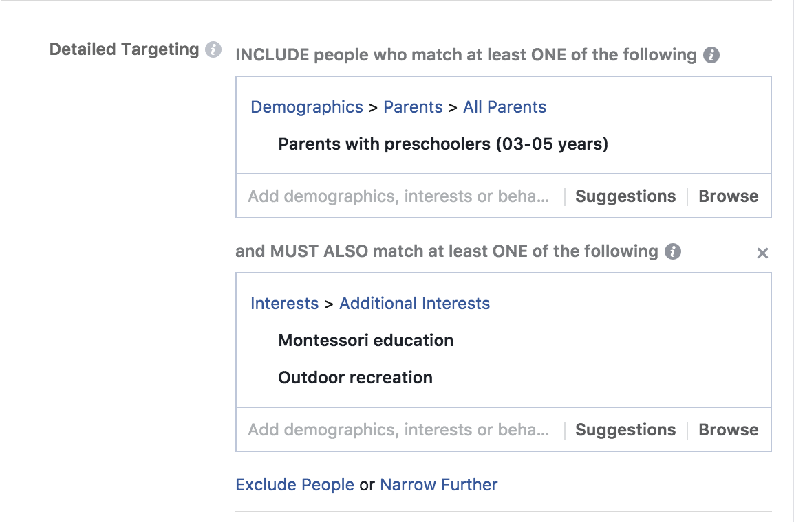 This ad set would be shown to people who are parents of preschool-aged children AND who are interested in Montessori education OR outdoor recreation.