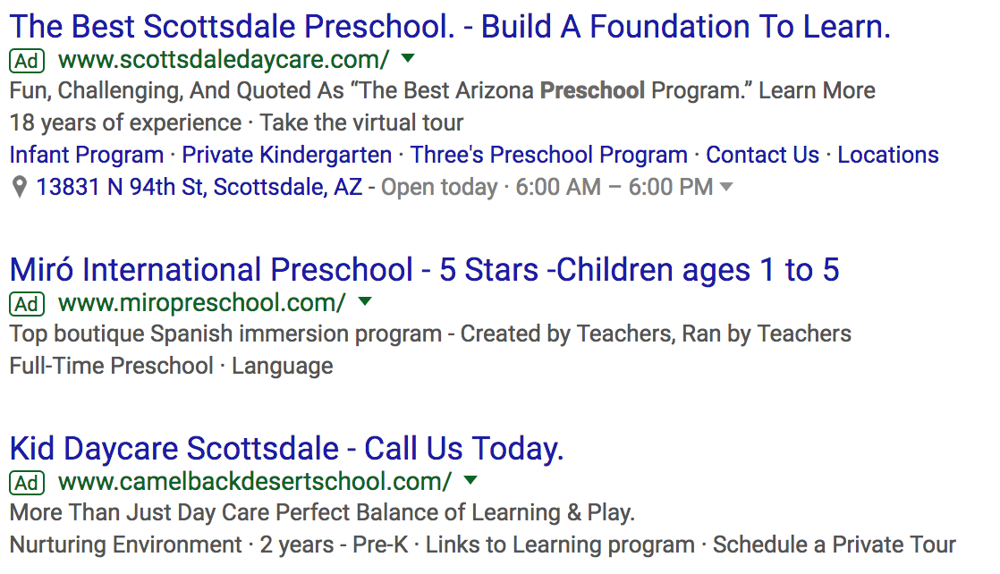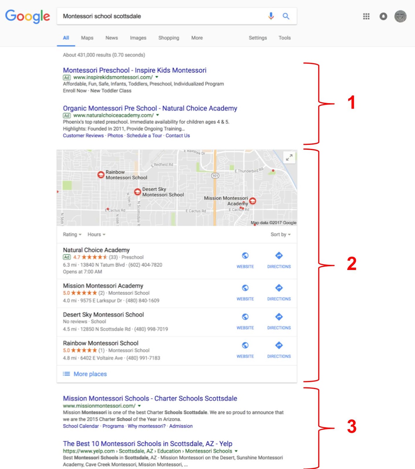 For example, when I search for “Montessori school Scottsdale,” here are the results I get:
