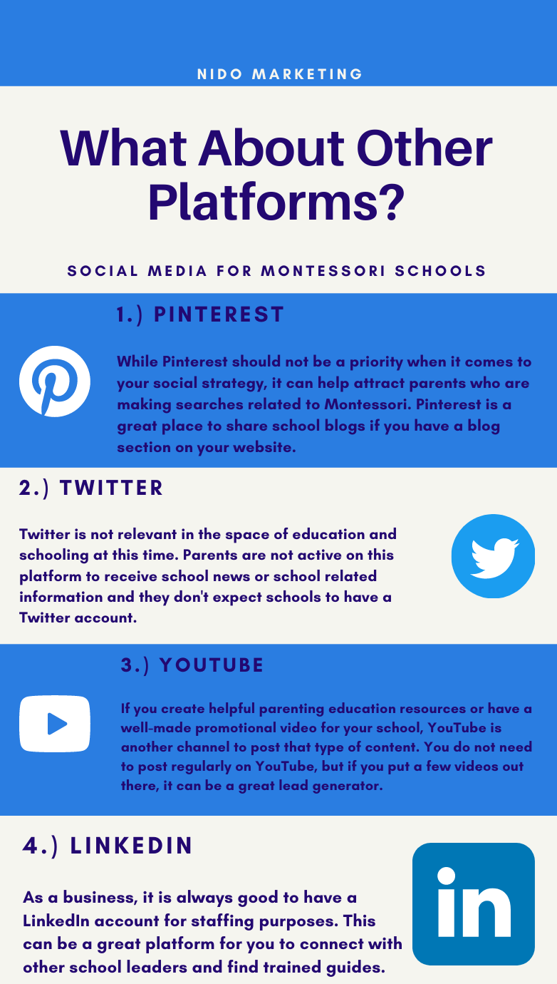 Instagram. This platform is all about visuals, so having good pictures is key. It’s perfect for showcasing your beautiful classroom environments, as well as snippets of everyday life at your school. Besides sharing videos and photos, Instagram has also introduced “Instagram Stories” which allows you to share visual content for 24 hours (great for promotional announcements, open houses, and upcoming parent education information). Users of this platform are between the ages of 18 and 35, so, if you have a younger target audience, it’s better to reach them on this platform. Younger parents are likely to check this platform several times a day, so it can be a great place to give immediate news updates, share school news, and share fun content as well.