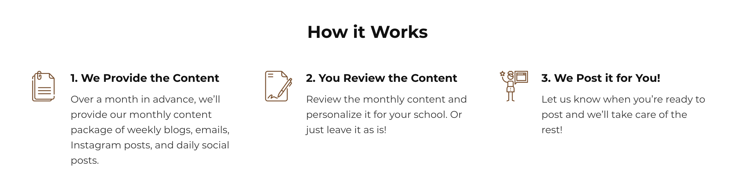 - Consider a content service: If you would like to focus your time on the families you serve without having to worry about keeping up with your social channels, perhaps consider a done for you service! Montessori Thrive offers a great service to Montessori schools with their Montessori Content Package. Along with blog posts, access to a huge Montessori stock photo library, parenting videos, and emails, you will also receive a done for you social media package. This means that the Facebook posts and Instagram posts are posted for you!