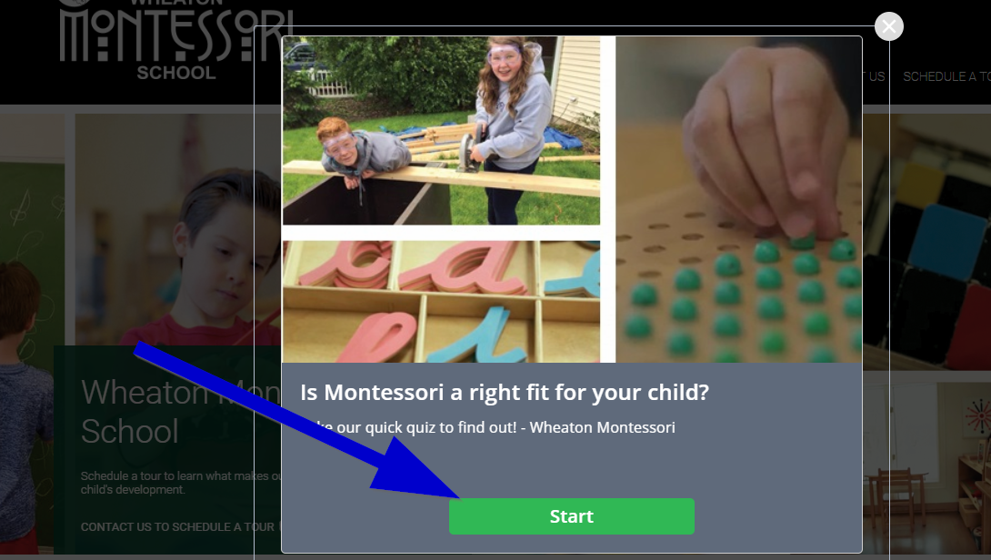 The “Start” button leads the visitor to a quiz, “Is Montessori a right fit for your child?”