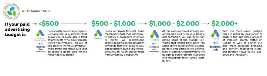 In this range, we don’t recommend using Facebook or Instagram at all. While those channels are extremely valuable when it comes to remarketing and, in some instances, branding, they aren’t delivering prospects who are actively looking for you the way Google is.